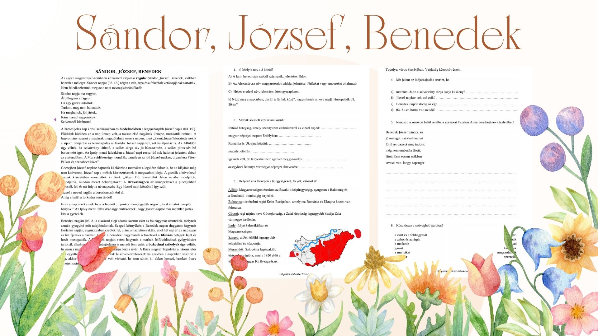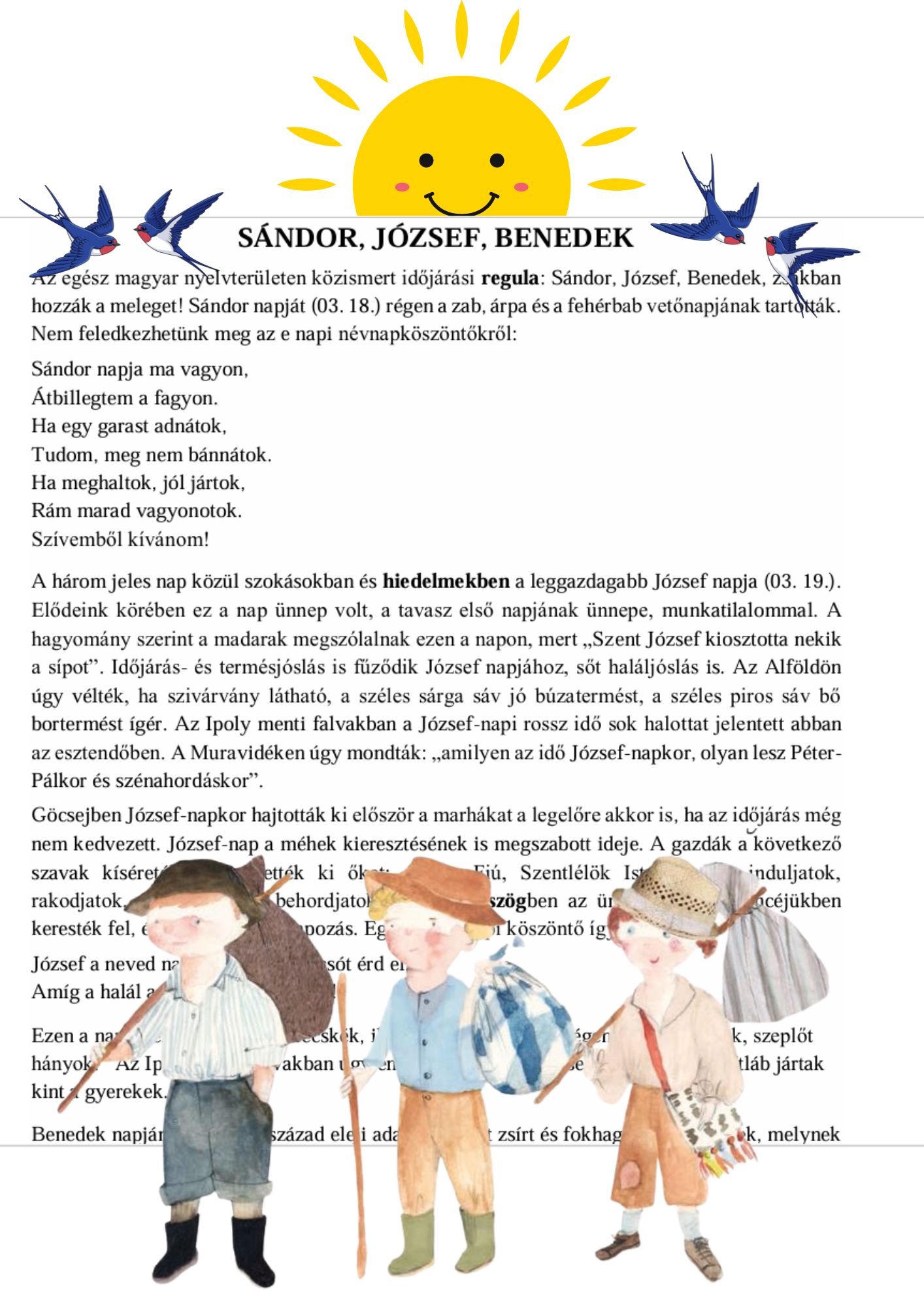 A szövegértési feladatlap Sándor, József, Benedek névnapjához és annak népszokásaihoz kapcsolódik, amely ünnep a magyar néphagyomány szerint a tavasz beköszöntét jelzi. A feladatok 4. osztályosoknak és felső tagozatosnak készültek, játékos formában ismerteti meg a tanulókkal a jeles napokhoz kötődő versikéket, népi idő– és termésjóslásokat.