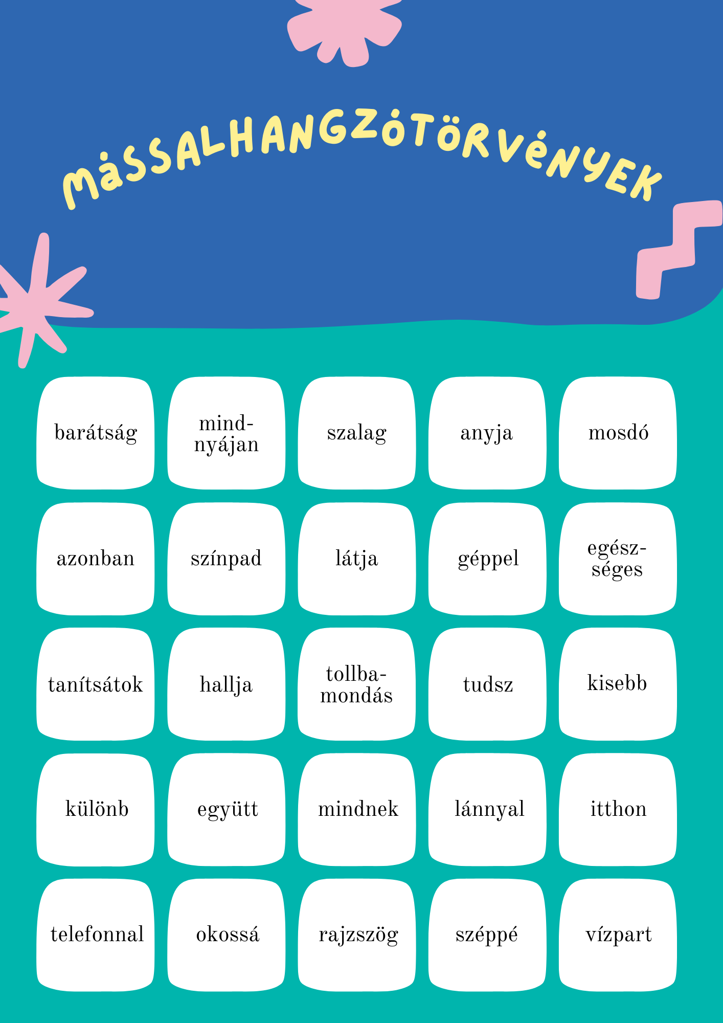 A fehér lapon lévő szavakat vágjátok csíkokra, és keverjétek össze. A játékosok jelöljenek ki egy sort vagy egy oszlopot! A játékvezető húzzon egy szót a kalapból. Annak a párját ki kell ikszelniük a játékosoknak lapjaikon. Akinek elsőként jön ki a sora / oszlopa, nyert!