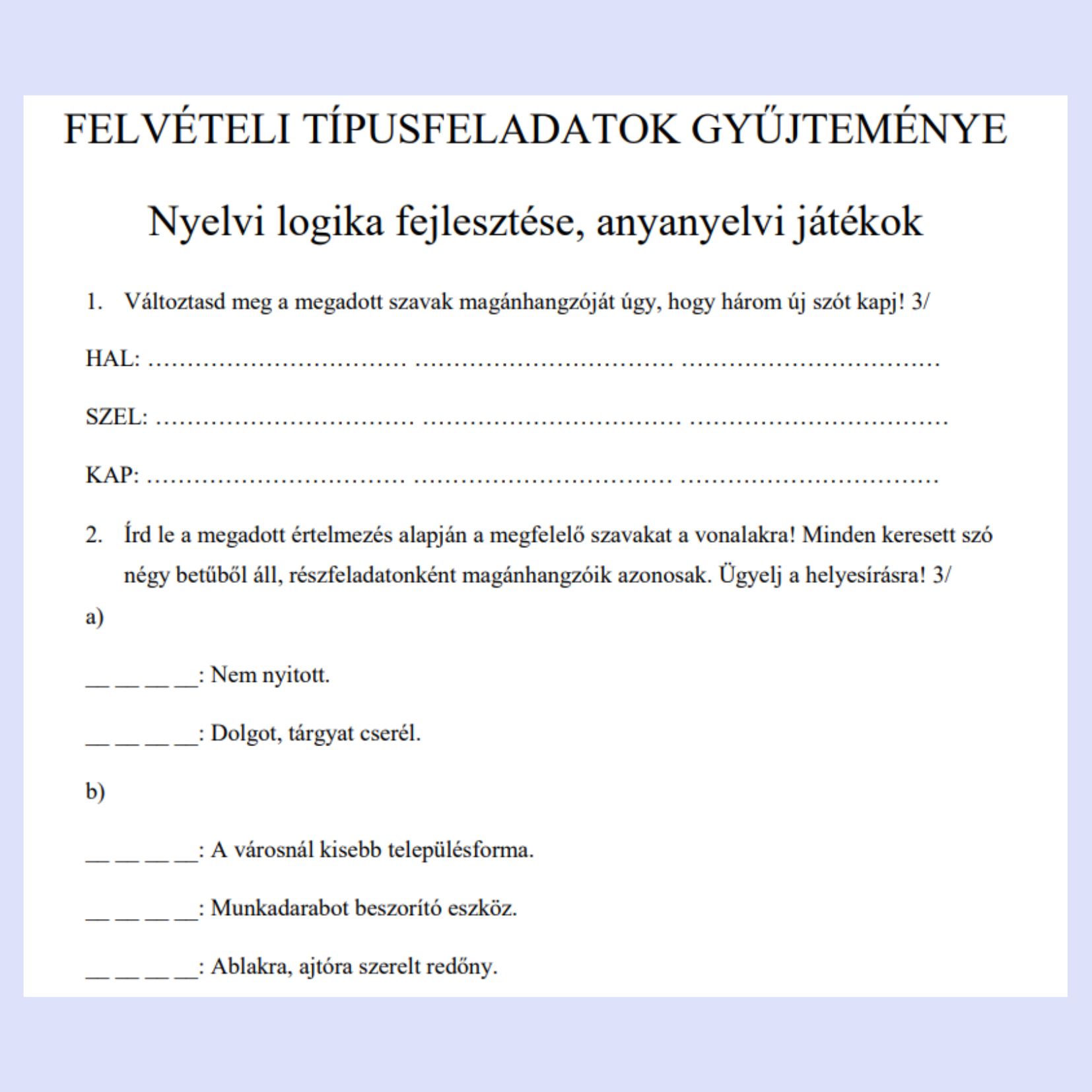 Felvételi típusfeladatok 1. – Nyelvi logika, anyanyelvi játékok 6. osztályosoknak