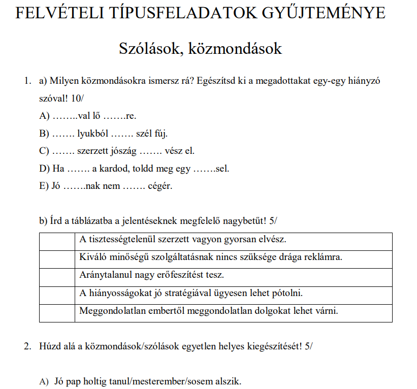 Felvételi típusfeladatok 2. – Szólások, közmondások 8. osztályosoknak
