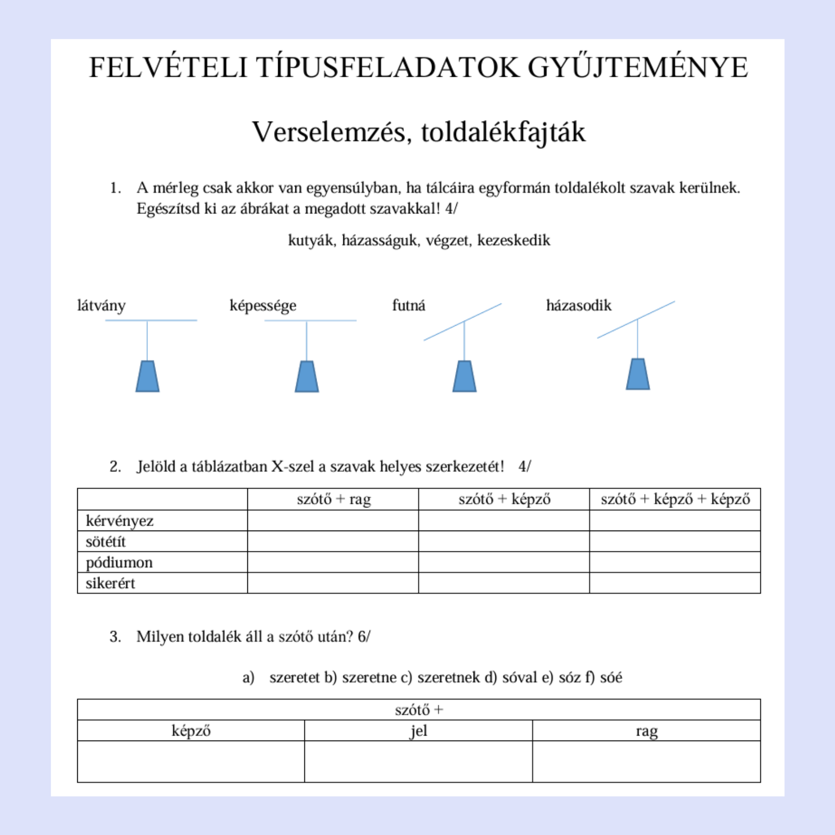 Felvételi típusfeladatok 3. – Verselemzés, szóalaktan (képző, jel, rag) 6. osztályosoknak