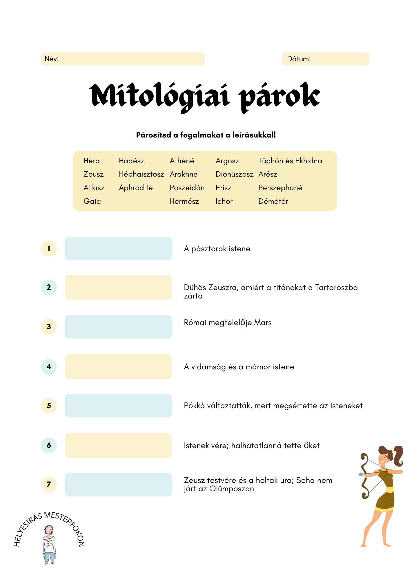 A görög mitológia tele van színes és lenyűgöző karakterekkel, mint például a villámok istene, Zeusz, vagy éppen a bölcsesség és hadvezetés istennője, Athéné. Ezen a feladatlapon lehetőséged lesz megismerni őket, és még sok más izgalmas alakot, helyszínt és lényt!