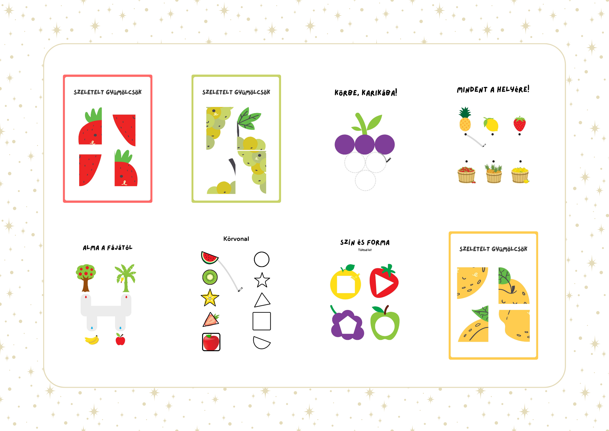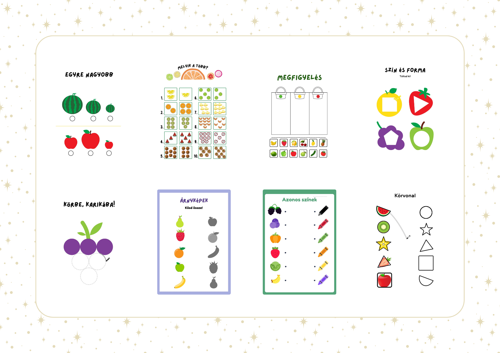 A gyümölcsös fejlesztőlapokkal játszva tanul a gyermek! A szabadidő hasznos eltöltésére, vagy iskolára készülve gyakoroljatok vele!