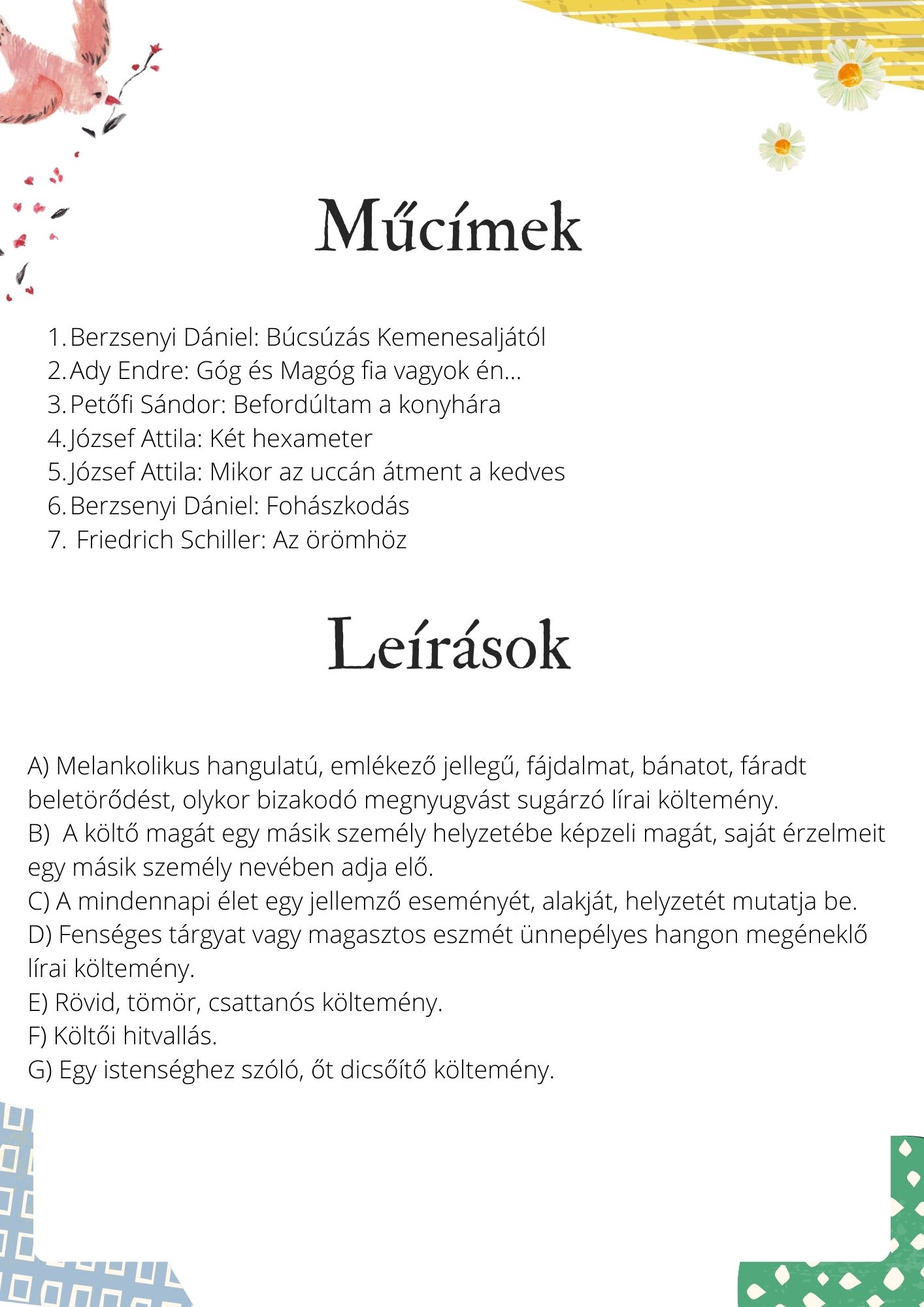 - lírai műfajok (műfaj + verscím + definíció párosítása)