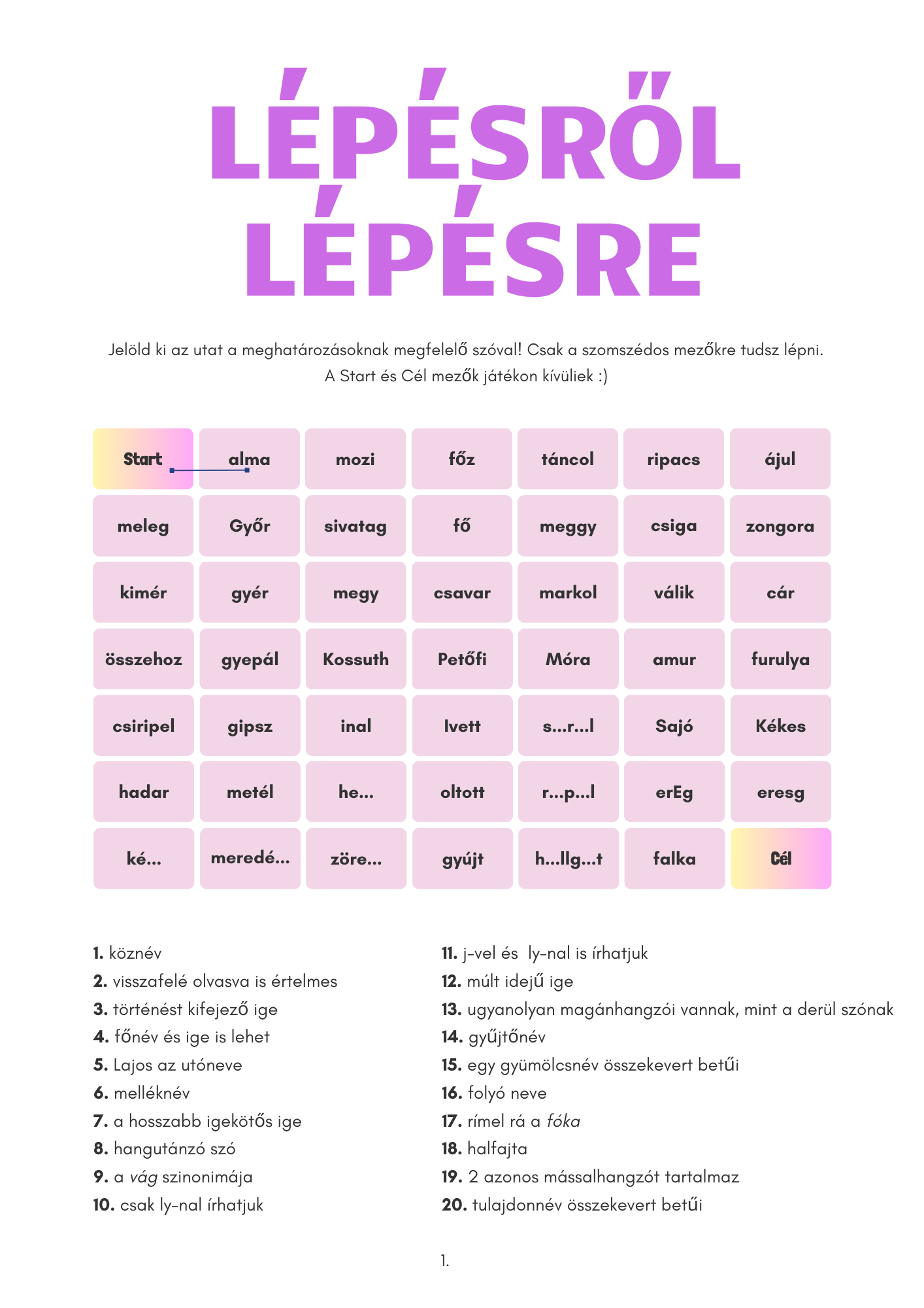 Játékszabály: A Starttól a Célig kell eljutni. A soron következő meghatározásnak megfelelő szó mezőjére kell lépni, mindig csak a szomszédos mezők egyikéből lehet választani, többet nem lehet lépni.