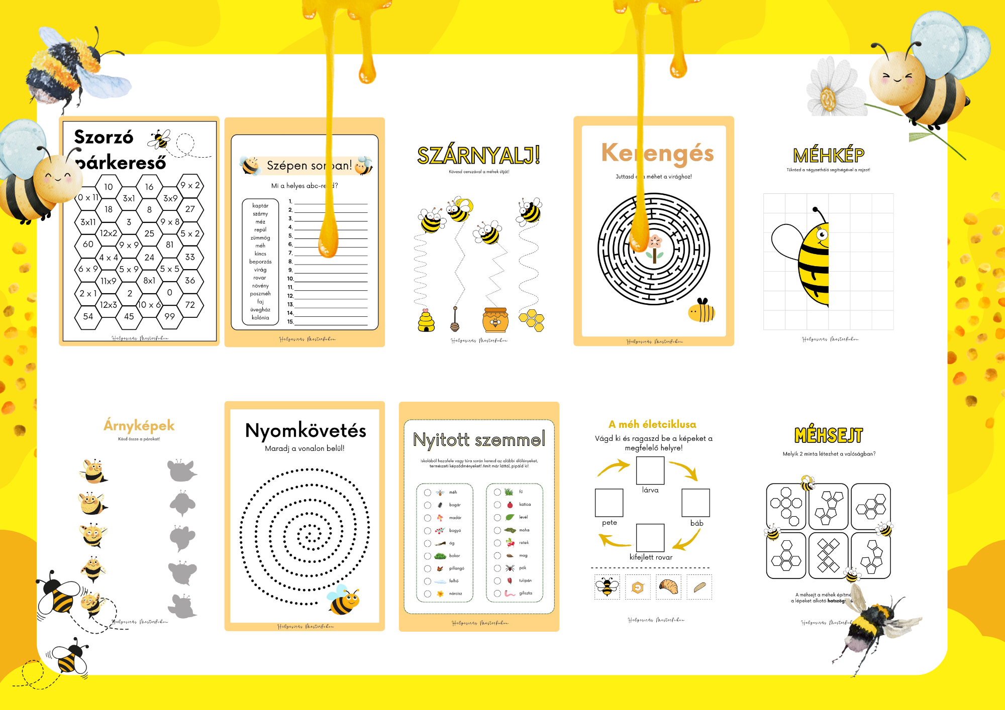 Készen állsz a mézes kalandra? A Méhek napja fejlesztőfüzet izgalmas, színes és szórakoztató módja a tanulásnak. A játékos feladatok segítenek fejleszteni a gyerekek kognitív készségeit, miközben elmerülnek a méhek és a természet varázslatos világában.