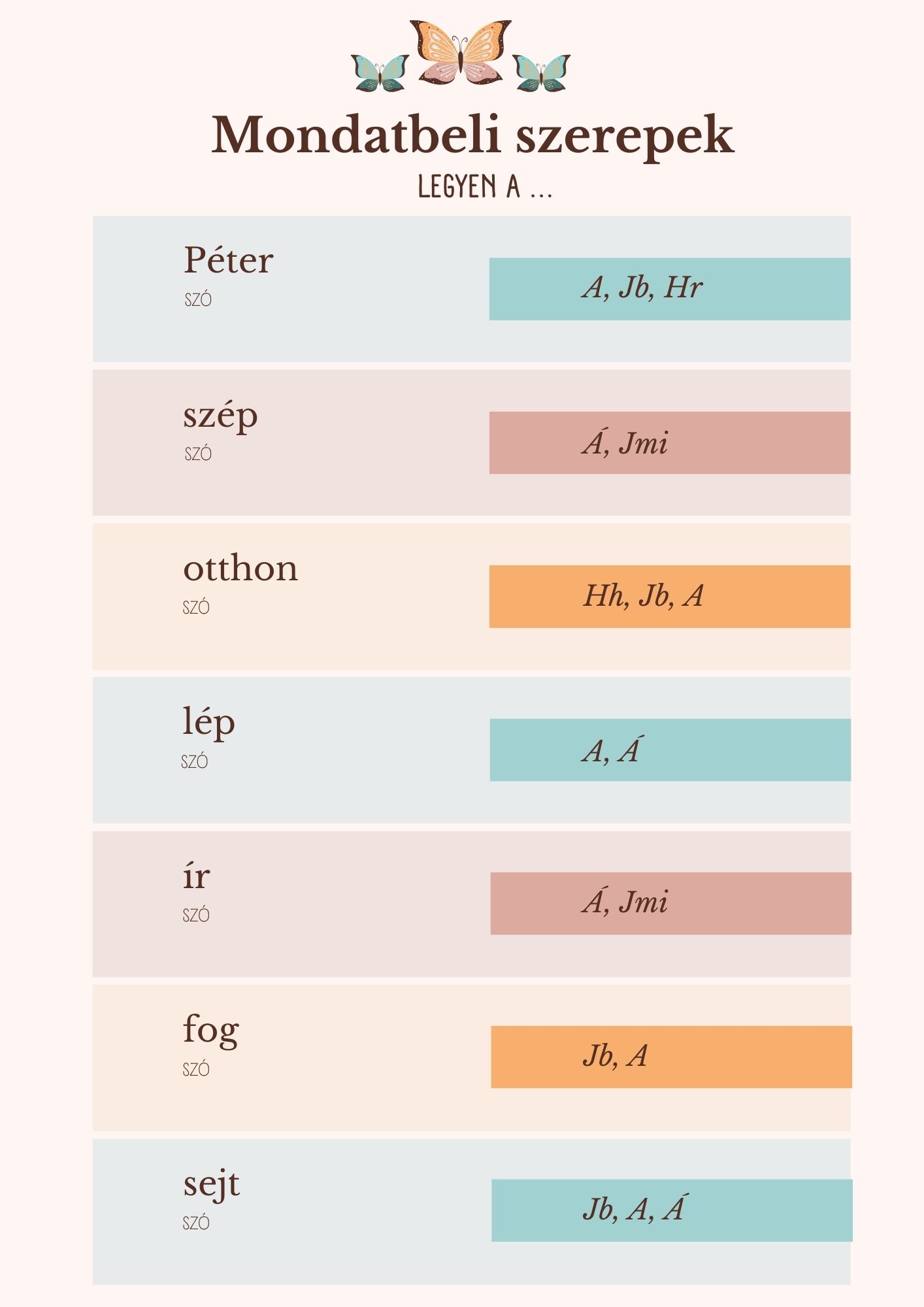 - mondatrészek (jelzők, határozók, alany, állítmány, tárgy) és kérdeseik