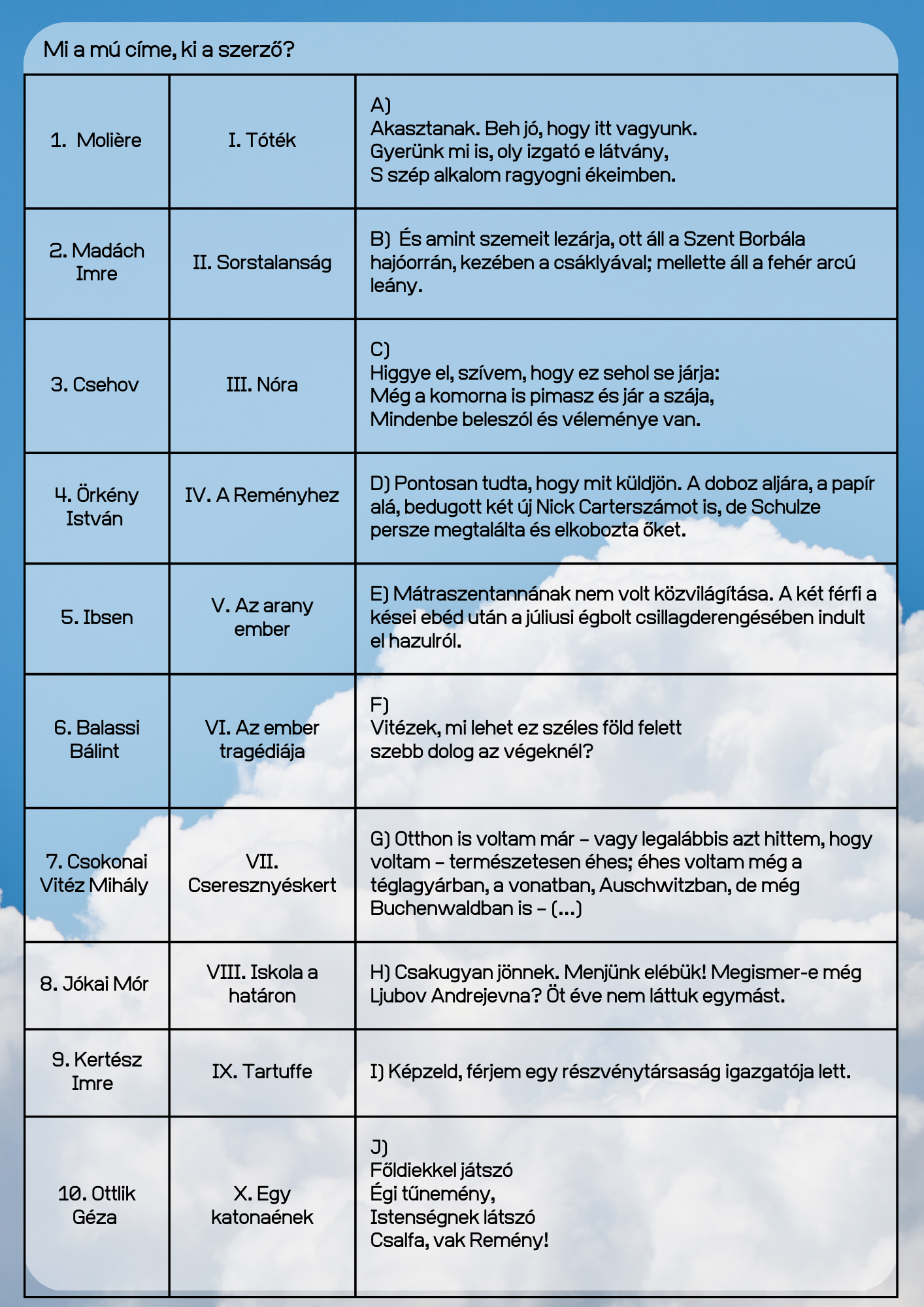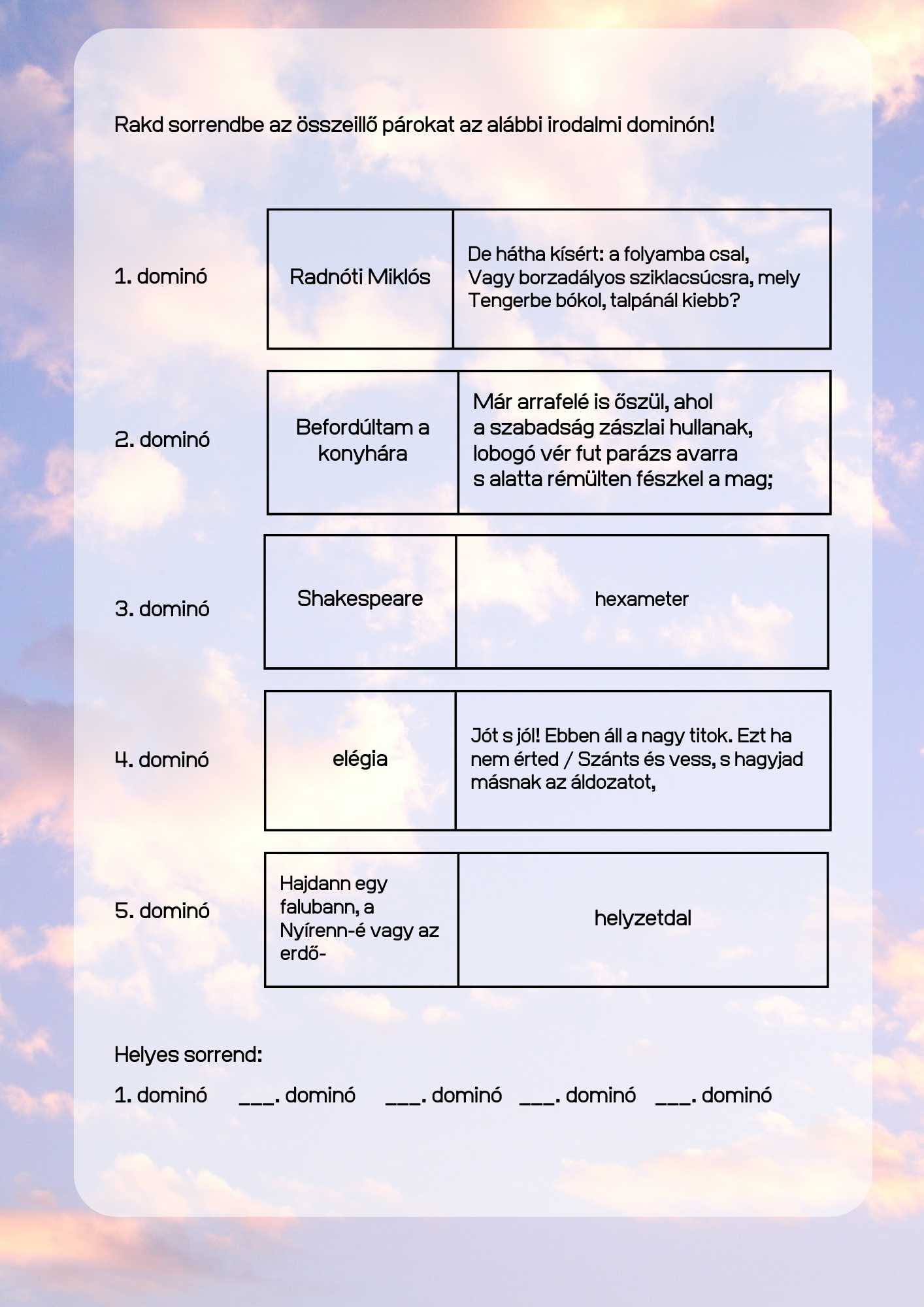 - irodalmi dominó (fogalmak, műcímek, versformák, szerzők mentén)