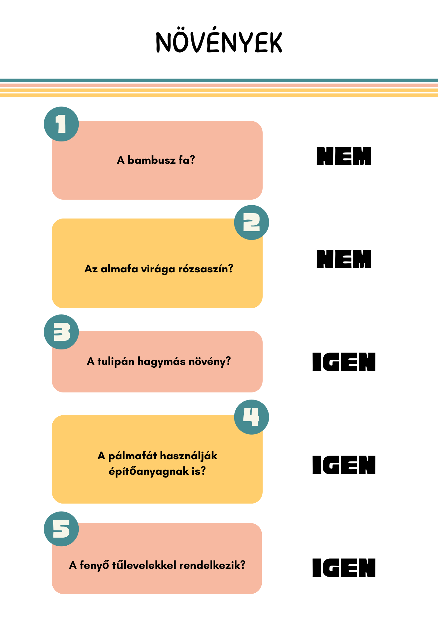1. A csapat választ / húz egy témát. 5 kérdésre kell igennel vagy nemmel válaszolniuk 1 perc alatt közösen. A megoldások száma alapján pontot kapnak. A legtöbb pontot szerző csapat nyer.