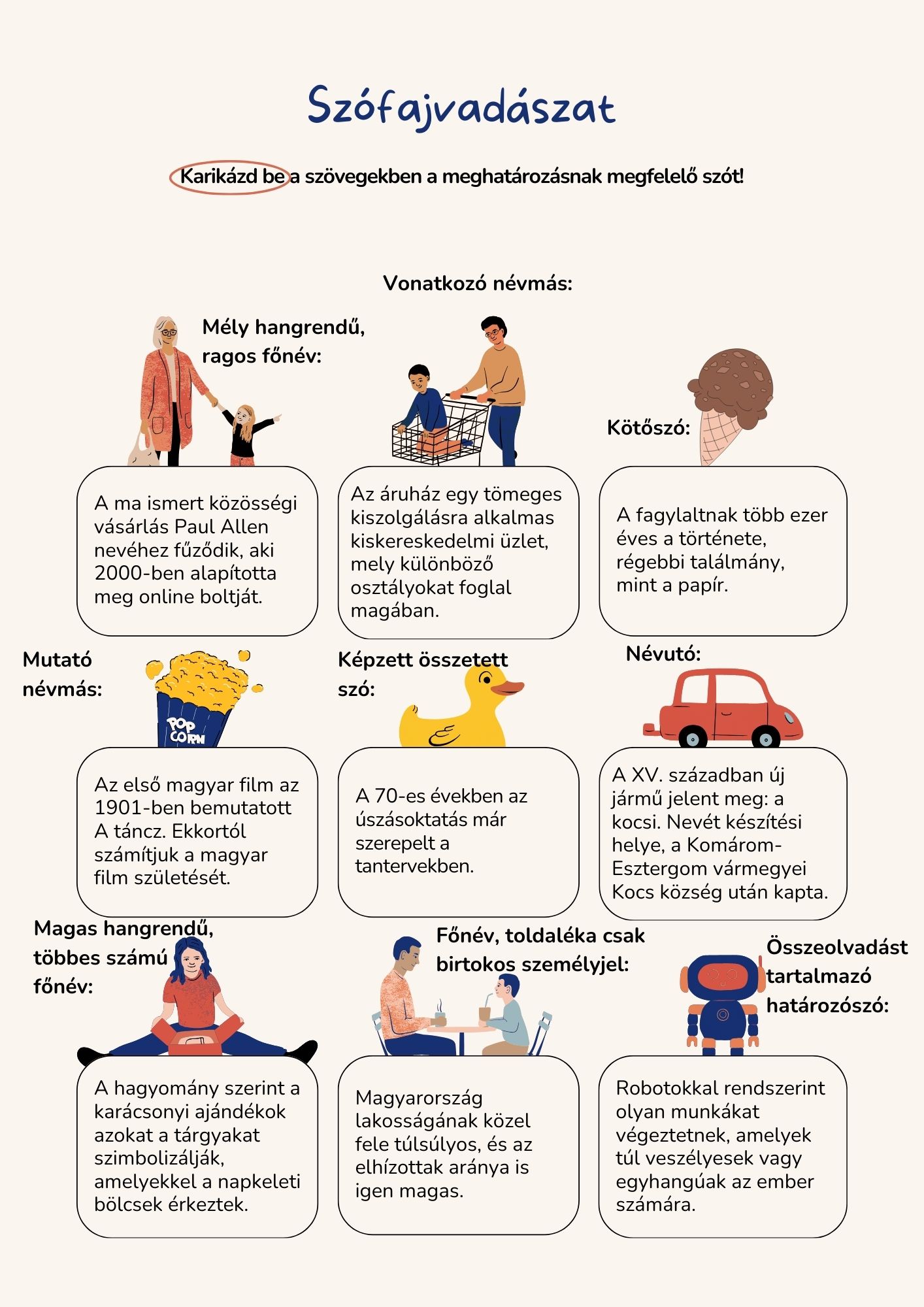 A nyelvtan alapja a szófajok ismerete. Játékos feladatlapunkkal segítünk megérteni, készségszintre fejleszteni a szófajok rendszerének elsajátítását, mely a felvételi vizsga vázát jelenti.